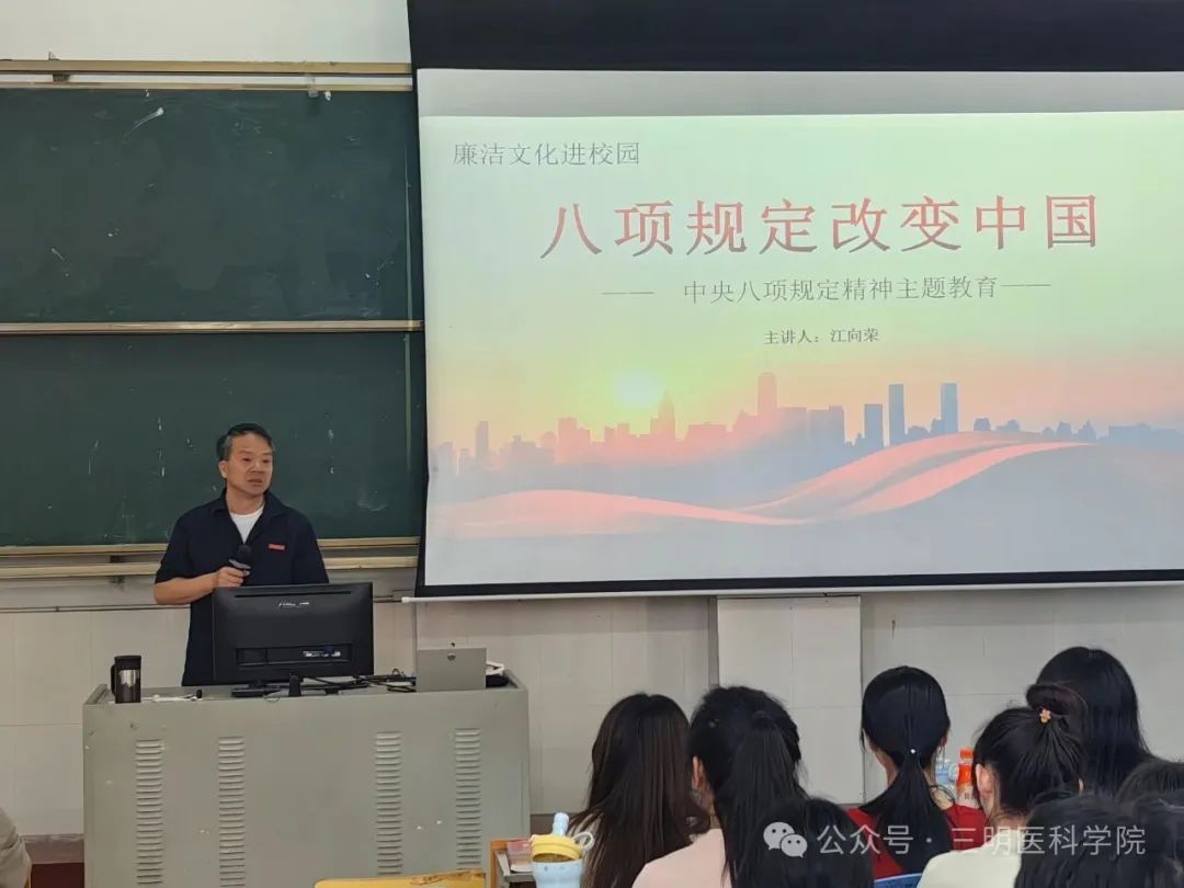 5月14日下午,院纪委书记江向荣为2024级大数据与会计1、2班的学生讲授廉洁文化进校园《八项规定改变中国》专题思政课。