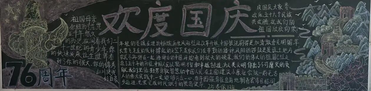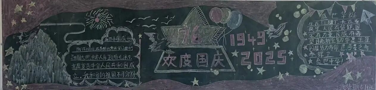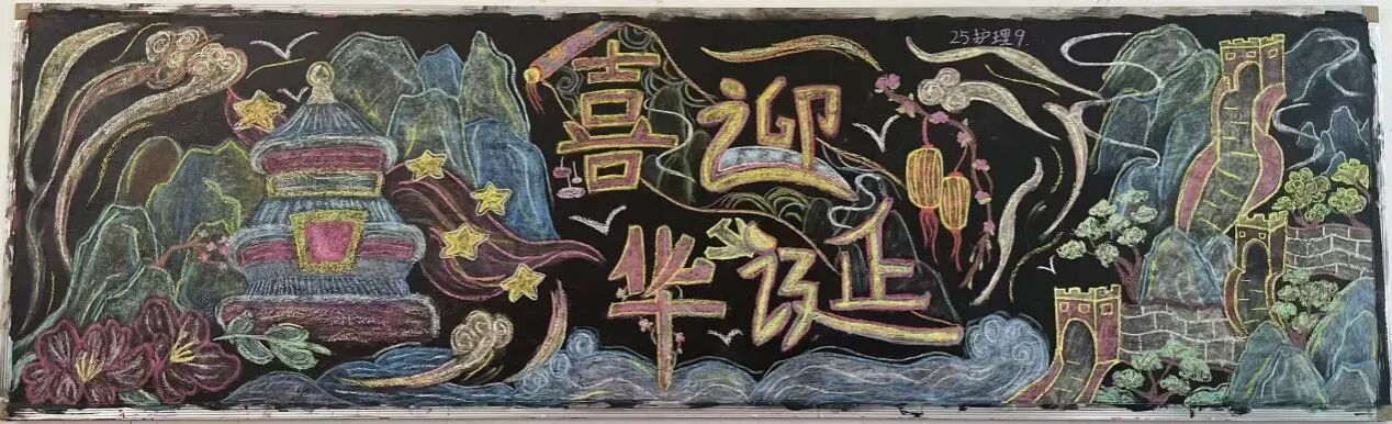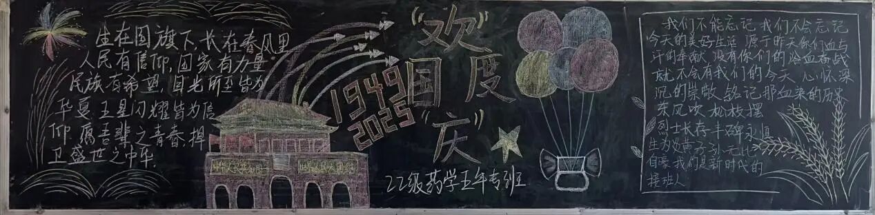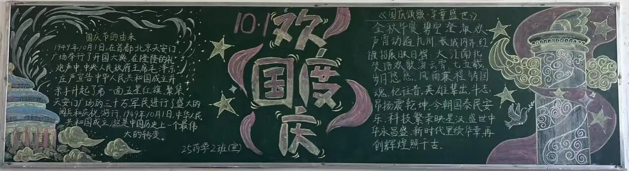 活动启动后,各班级团支部迅速响应、积极行动,纷纷组建创作小组共同构思设计方案。黑板之上,鲜艳的五星红旗似迎风舒展,天安门、华表等象征国家形象的元素庄重醒目,与“盛世华诞,国泰民安”“以青春之名,护家国安康” 等主题标语相互呼应,字里行间传递出对祖国母亲的深切祝福;创作过程中,同学们分工协作、默契配合,从版面布局、色彩搭配到内容撰写,每一个细节都反复打磨、精益求精。有的同学专注勾勒主体图案,用细腻的笔触还原国庆盛景;有的同学深耕文字创作,摘抄经典爱国诗句、讲述红色医护故事,让黑板报既具“颜值” 吸引力,更富 “内涵” 感染力。接下来,就让我们一同欣赏同学们笔下的精彩作品!