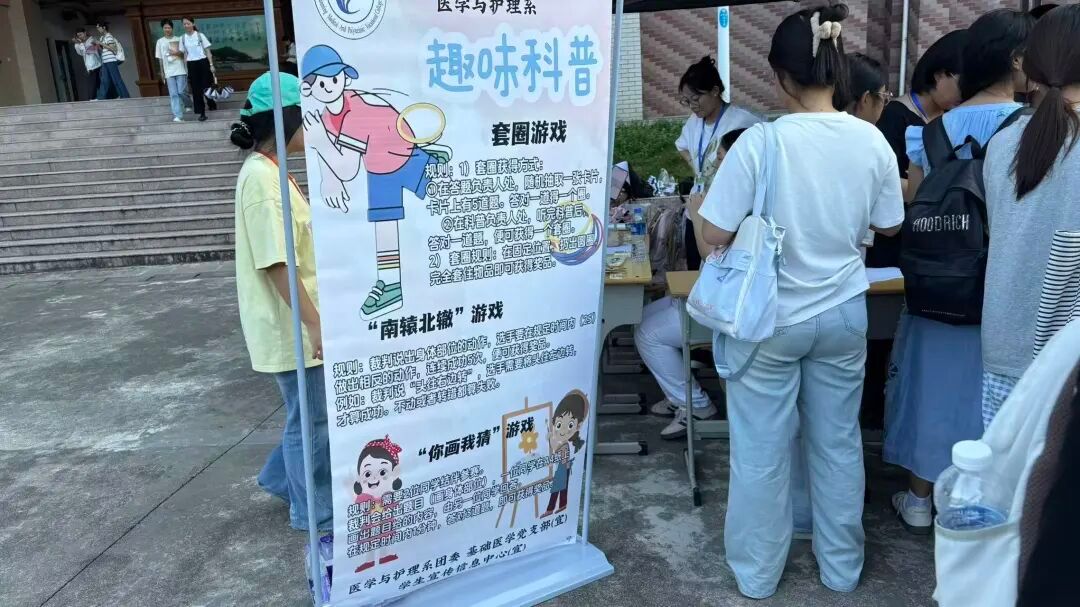 9月28日,知识竞赛初赛率先开启,参赛选手齐聚现场,经过测试考核,优胜者脱颖而出晋级决赛。决赛阶段切换为现场抢答模式,选手们反应敏捷、答题精准,凭借扎实的专业储备展开激烈角逐,充分展现了过硬的知识素养。10月10日,趣味科普活动在朱子广场拉开帷幕,三项互动游戏让专业知识“活”了起来。“套圈游戏”前,同学们或围在答题区专注答题,或跟着 “学术使者” 听完科普后参与问答,凭知识赢取套圈;当圆圈稳稳套住目标、兑换到心仪奖品时,大家脸上满是“学知识”与“得奖励”的双重喜悦。“南辕北辙”游戏将氛围推向高潮,裁判指令刚落,参与者便迅速做出反向动作,敏捷的反应与配合引得欢呼声此起彼伏,充满欢乐。“你画我猜”则是搭档间的默契较量,两人一组围坐桌前,一人勾勒医学相关画面,一人全力猜题,在笔尖流转与轻声探讨中,医学知识悄然深化,现场满是温馨协作的氛围。