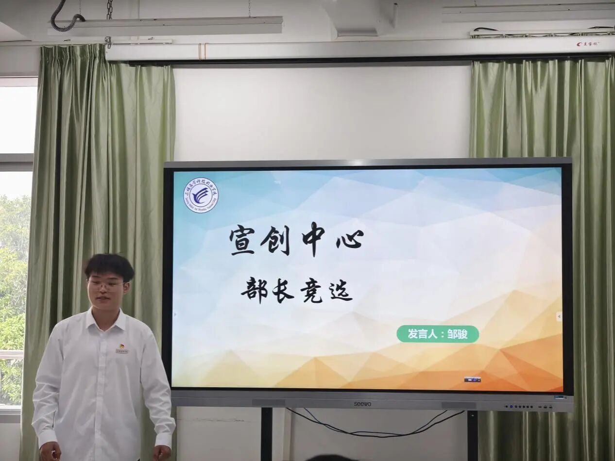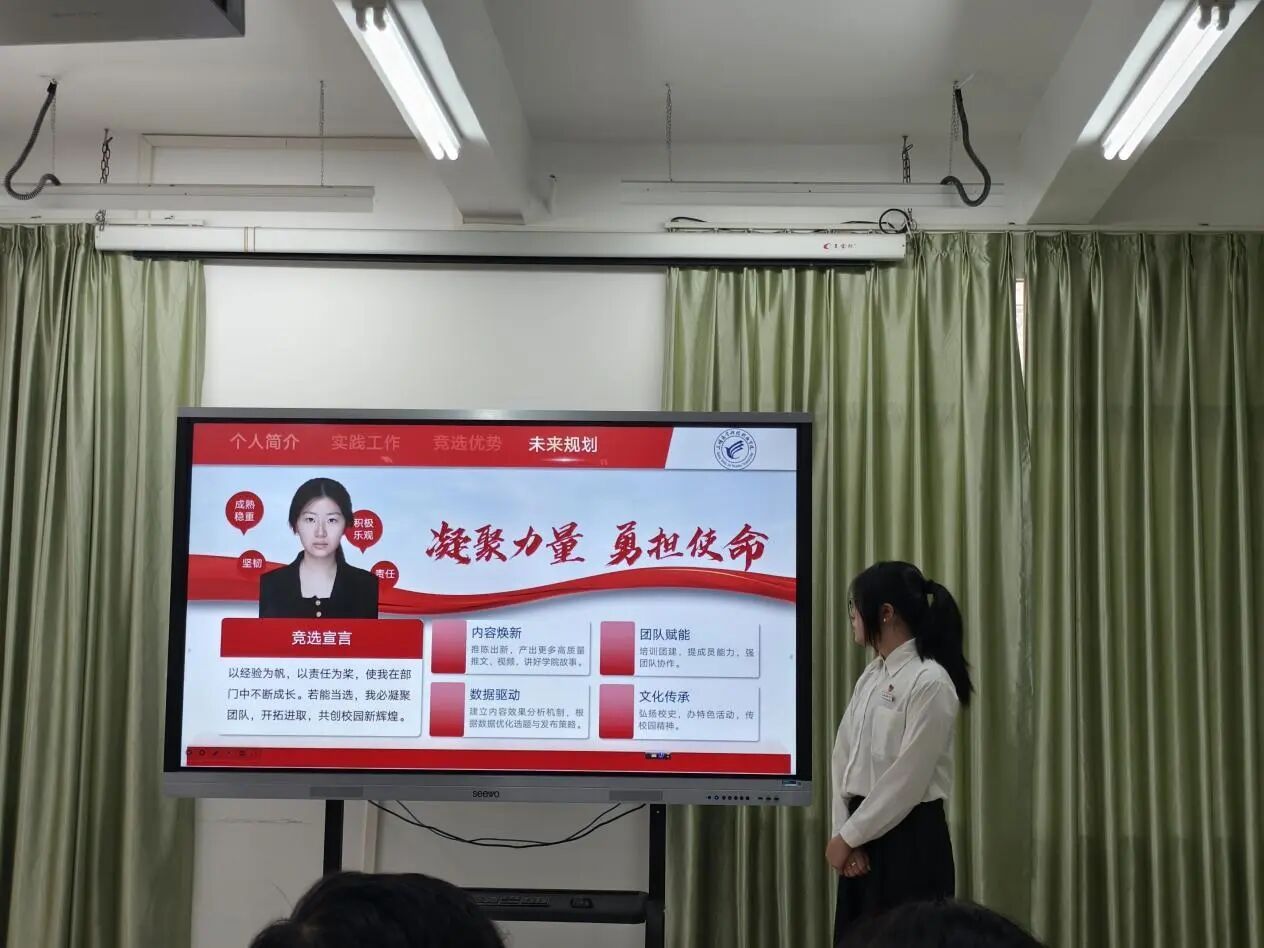 竞选现场气氛热烈、充满张力。各位候选人从容自信,带着精心准备的方案依次登台,从部门认知到服务理念,层层展开、娓娓道来。他们思路清晰、表达流畅,展现出有条不紊的素养与勇于担当的智慧。整个现场既有竞技般的紧张感,也洋溢着青春交流的温暖氛围。