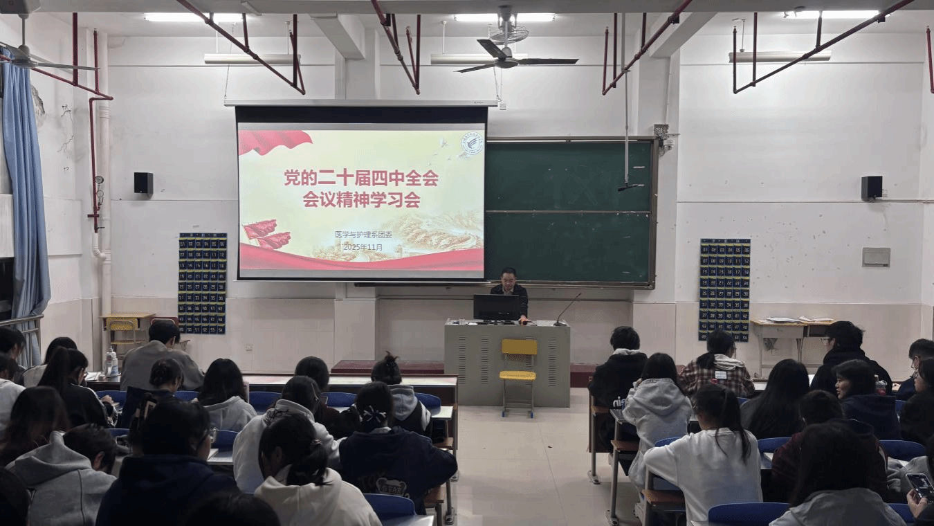 为深入学习贯彻党的二十届四中全会精神,引导青年团员深刻把握会议核心要义、筑牢理想信念根基,医学与护理系团委于11月13日在朱子楼阶梯4教室开展党的二十届四中全会精神专题学习会。系团委副书记(主持工作)王淞老师、系团委办公室成员、学生会干部及各班团支书参加了此次学习会。