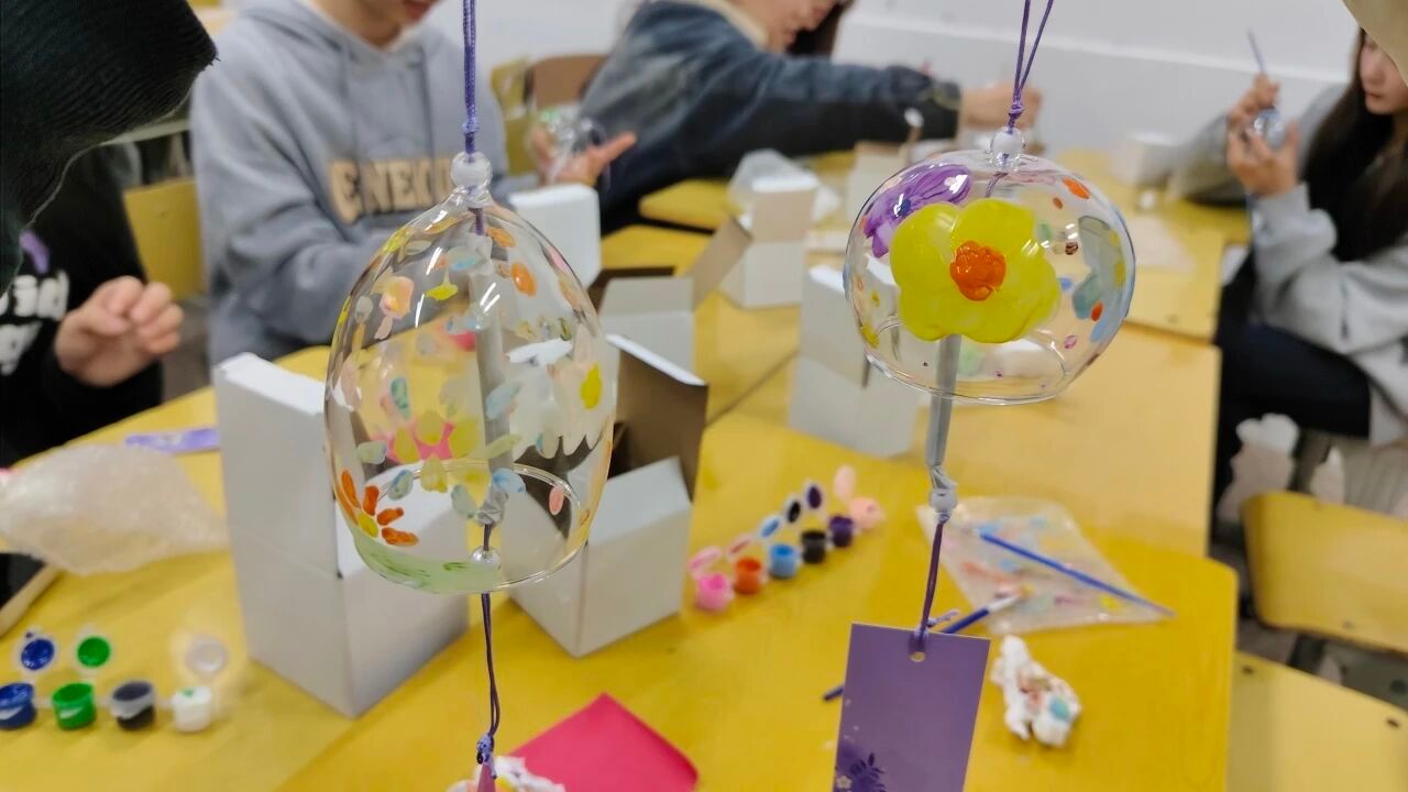 在“心灵风铃动”活动中,同学们亲手制作风铃并将其悬挂起来,聆听着那清脆的声响,感受着动与静之间的宁静与愉悦,让心情随着微风轻轻飞扬。