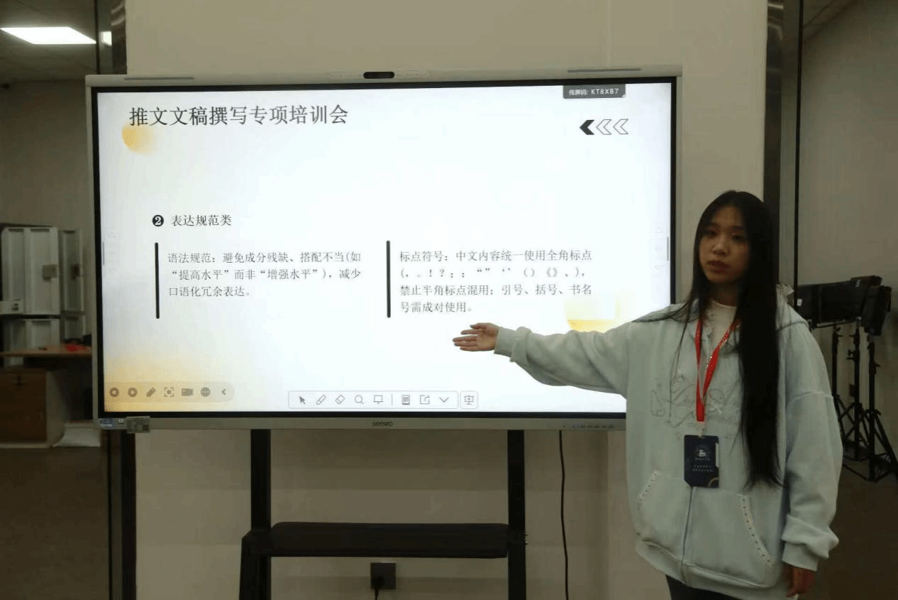 为进一步提升校园新媒体团队的推文创作能力,规范推文撰写标准,校学生宣传中心于2025年12月5日下午,在南区融媒体办公室召开“推文文稿撰写专项培训会”。本次培训会由部门负责人进行主讲,各系新媒体运营负责人及推文撰写人员参会,现场围绕推文核心逻辑、表达规范及案例实战展开深度学习。