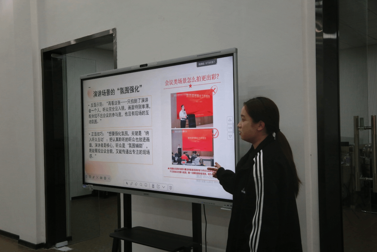 会议现场,部门骨干围绕“校园场景拍摄核心要点”展开讲解。从如何拍摄不同主题的拍摄角度选择、构图技巧,再到视频运镜的教学,现场互动氛围热烈。