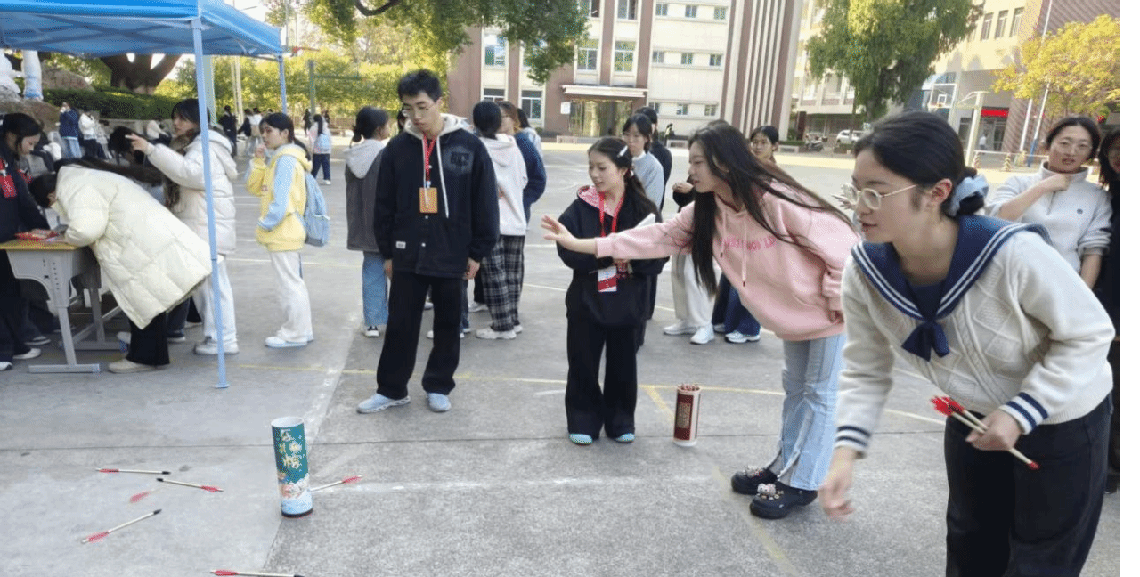 本次活动设四项趣味互动环节,以多元玩法传递校园温暖。“冬日投壶挑战”中,参与者专注瞄准后精准投掷箭矢,让传统雅趣与竞技乐趣相融,助力释放备考压力;“冬日心愿问卷”环节,同学们扫码完成暖心问题,围绕学习压力调节畅抒己见,收集心声的同时也传递贴心关怀。