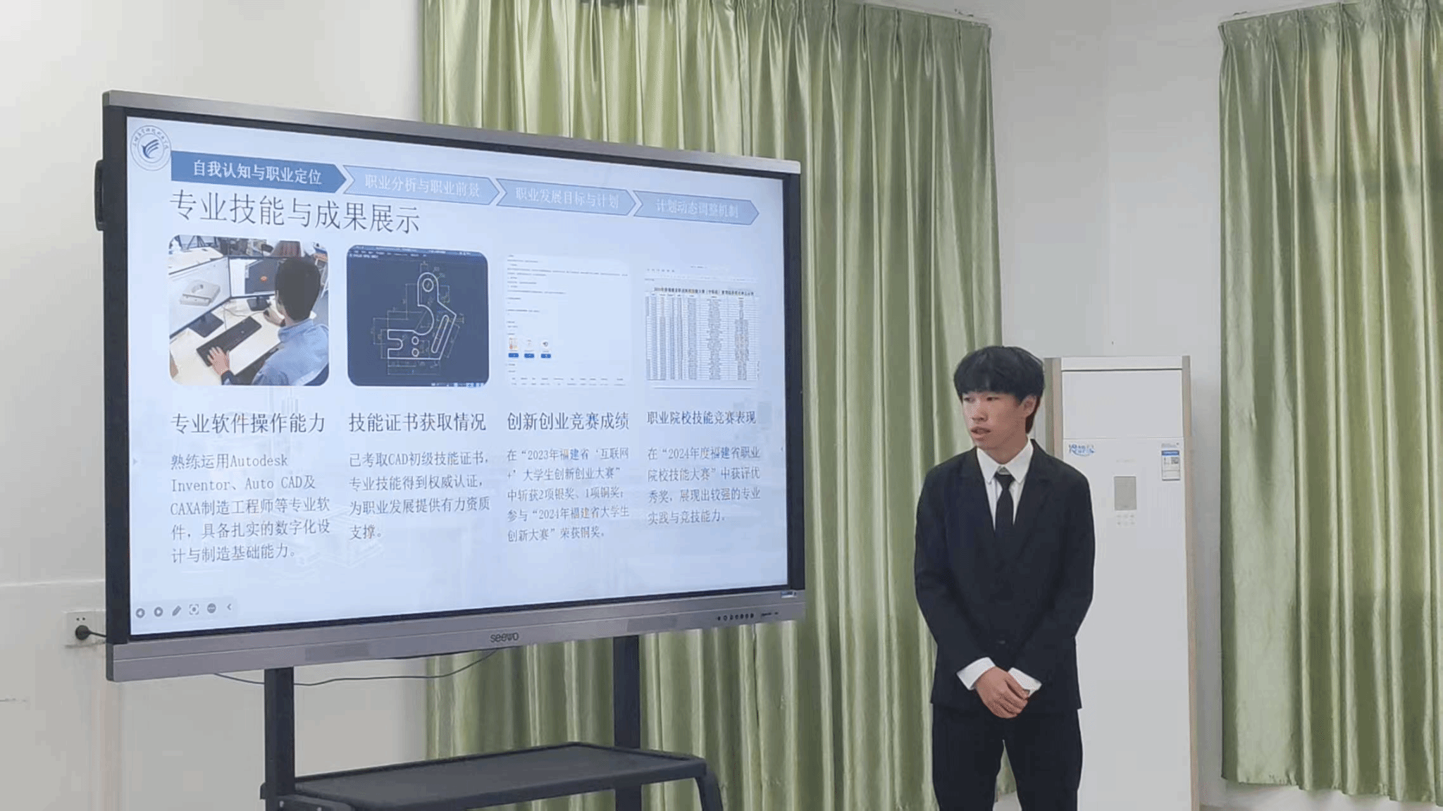 比赛现场,来自纺织、智能、机电、机械、数控、数媒、视觉等专业的14名选手依次登台,围绕职业目标设定、成长计划制定、学习实践行动及动态调整等方面展开精彩展示。选手们结合专业特色与行业趋势,通过PPT、视频等多种形式,生动诠释了从“自我认知”到“职业落地”的完整路径,展现出扎实的专业素养与清晰的职业视野。