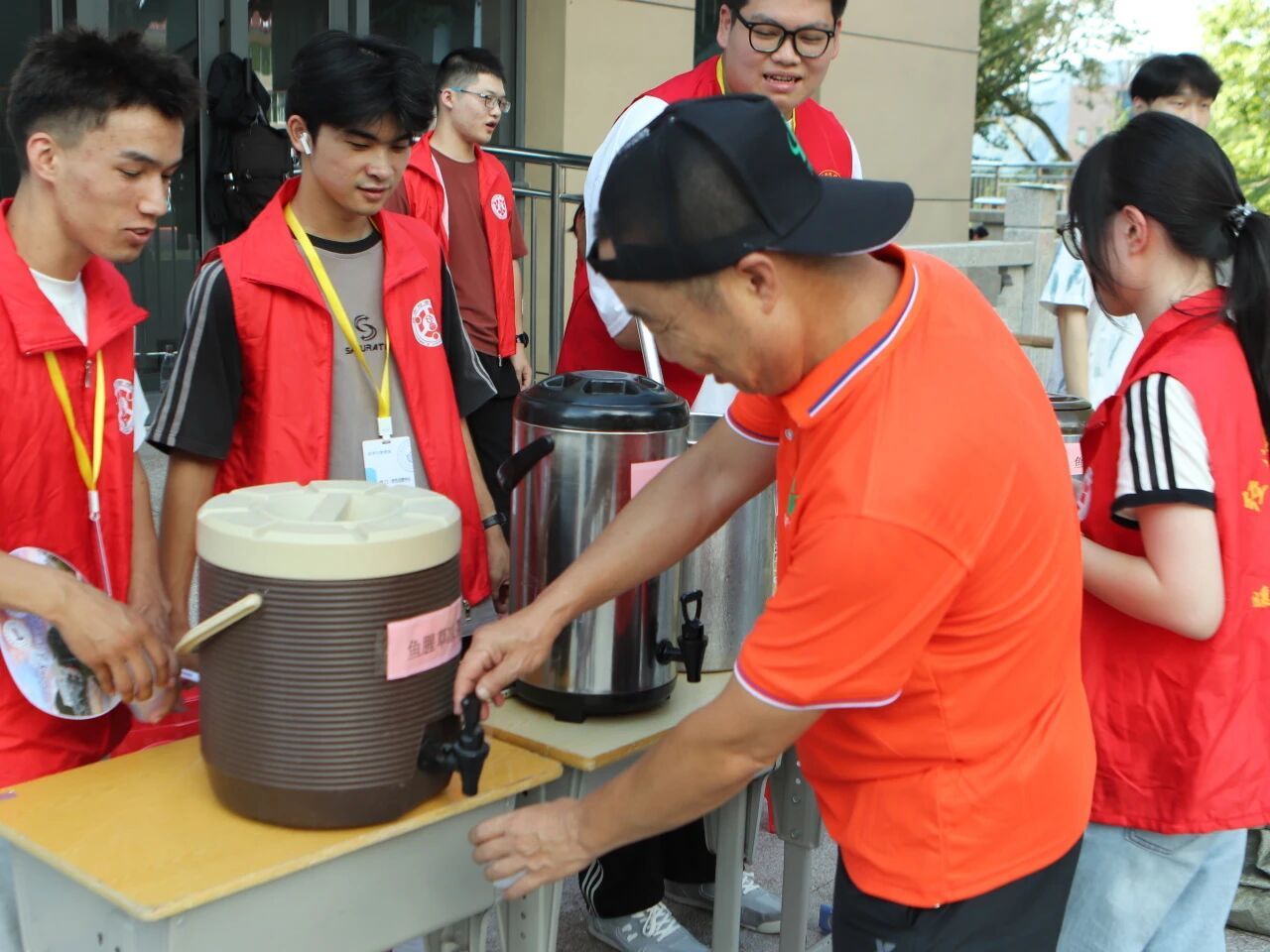在活动筹备阶段,志愿者团队精心挑选了金银花、菊花、鱼腥草等药食同源的食材,经过科学的配比和文火慢熬,制成了口感清爽、安全健康的解暑凉茶。军训日的清晨,服务点已经整齐地摆放好了保温桶和一次性纸杯,志愿者们身着统一的服装,将一杯杯温热适口的凉茶亲手递到新生手中,并耐心地讲解防暑常识,同时提醒新生注意饮食规律和作息调整等科学防暑方法,在烈日下为新生构筑了一道流动的“清凉屏障”。