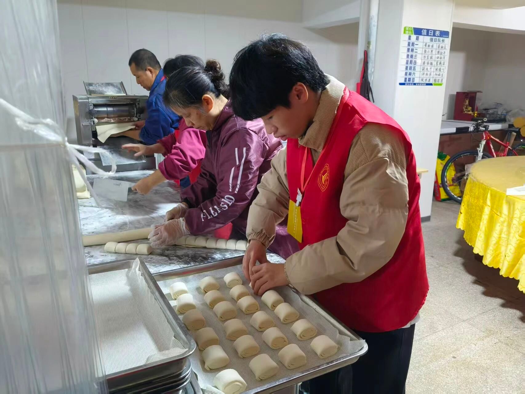 活动伊始,志愿者们便有序分工,揉面、分份、装盘、蒸制馒头,每一步都细致认真。在等待馒头蒸制的间隙,大家主动整理场地,清扫环境,确保环境整洁。