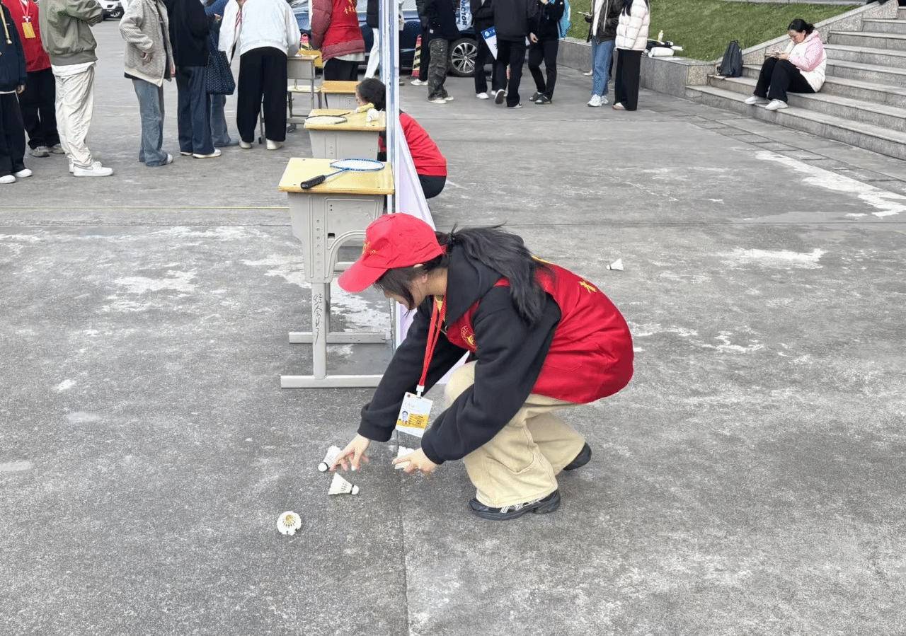 羽毛球趣味赛环节中,志愿者主动捡拾掉落羽毛球,耐心说明项目规则,配合裁判记录成绩、协调场次安排。