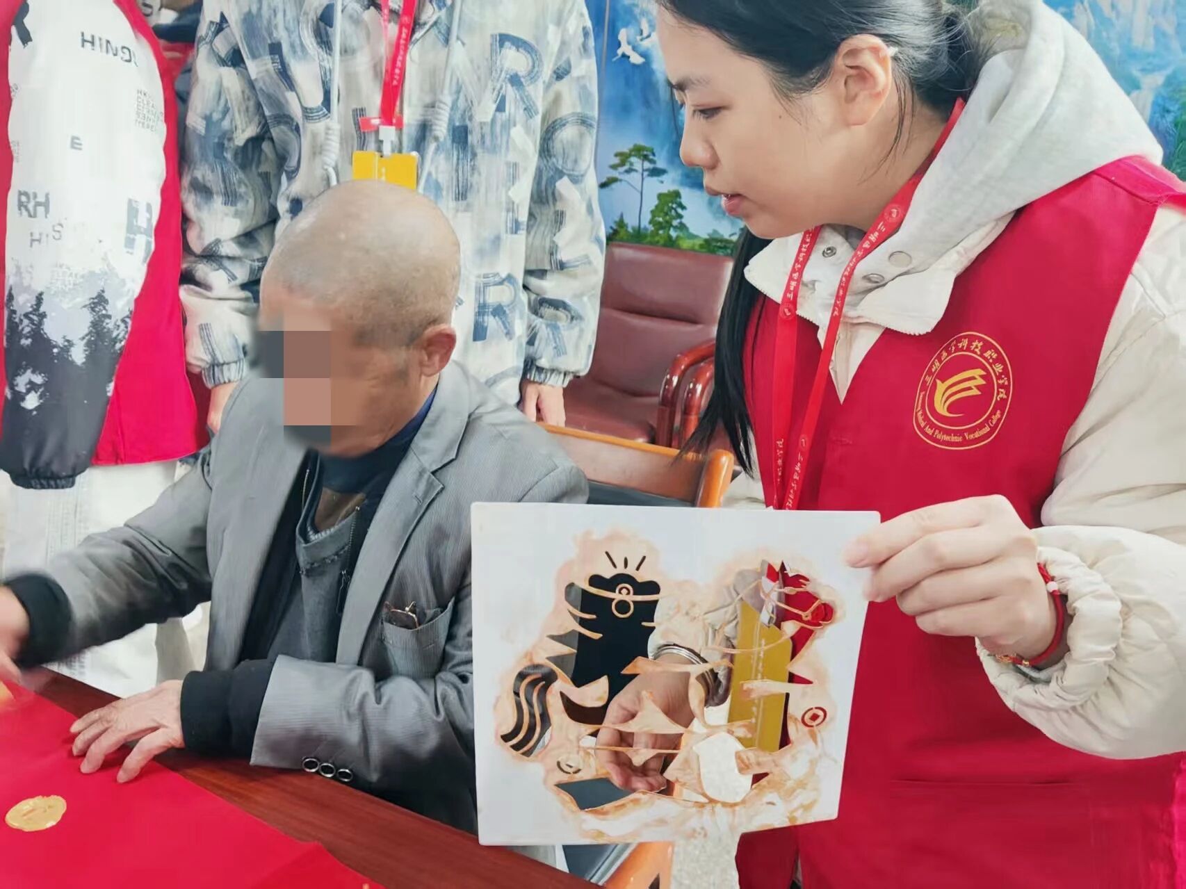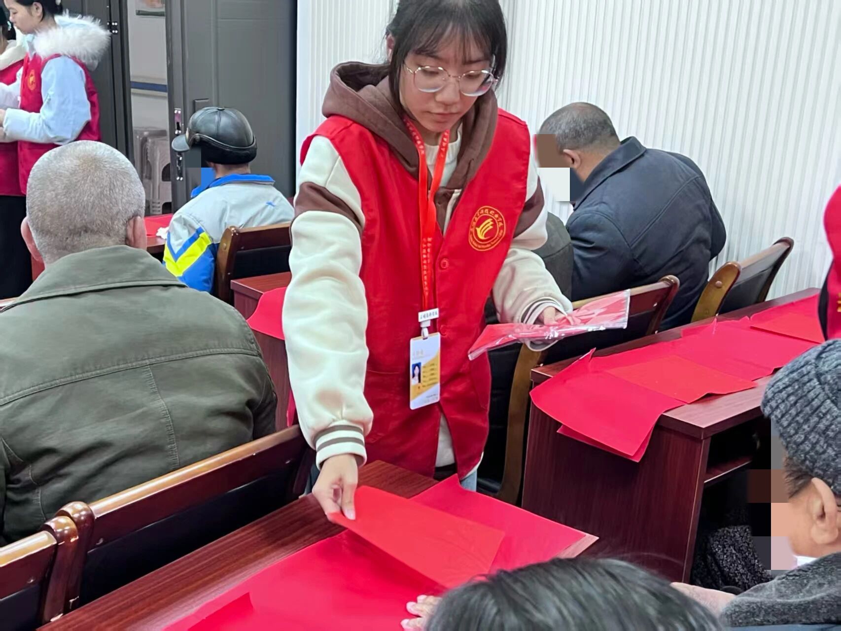活动当日,志愿者提前抵达养老院活动室开展筹备工作。他们细心布置场地、摆放好桌椅、笔墨和纸张,将印有“福”字模板的宣纸分发至每位老人手中。同时,志愿者清点骰子、整理实用奖品,确保活动安全有序推进。