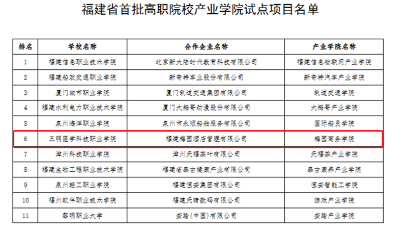 近日,福建省教育厅公布“福建省首批高职院校产业学院试点项目”名单,我校与福建梅园酒店管理有限公司共建的梅园商务学院成功入选该试点项目。
