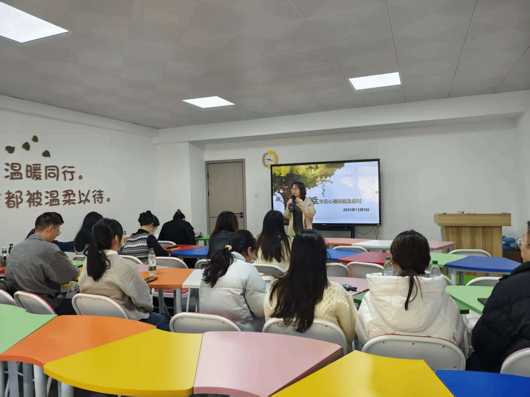 为切实提升 2025 年新入职辅导员的心理育人专业素养,精准识别大学生常见心理问题,12 月 9 日下午,我院开展 2025-2026 学年辅导员素质能力提升班第二期,培训在梦园 5 号楼 1 楼心理中心团体活动室 1 顺利开展。