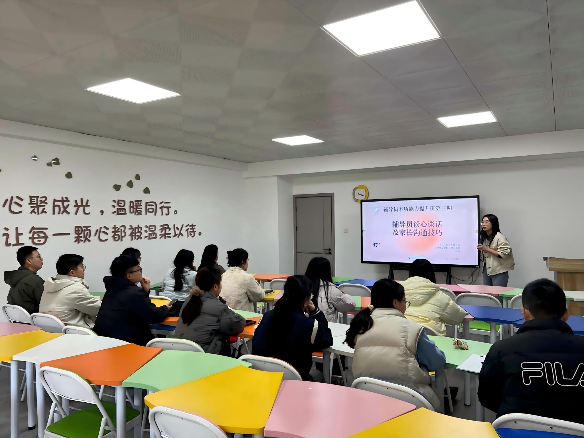 为提升新入职辅导员的职业素养与工作能力,助力其更好地开展学生心理辅导工作,12月17日下午,我院开展2025-2026学年第三期辅导员素质能力提升培训班,本次培训主题为“辅导员谈心谈话及家长沟通技巧”,由人文与教育系辅导员、心理中心兼职心理咨询师罗杭老师主讲,2025年所有新入职辅导员参加本次培训。