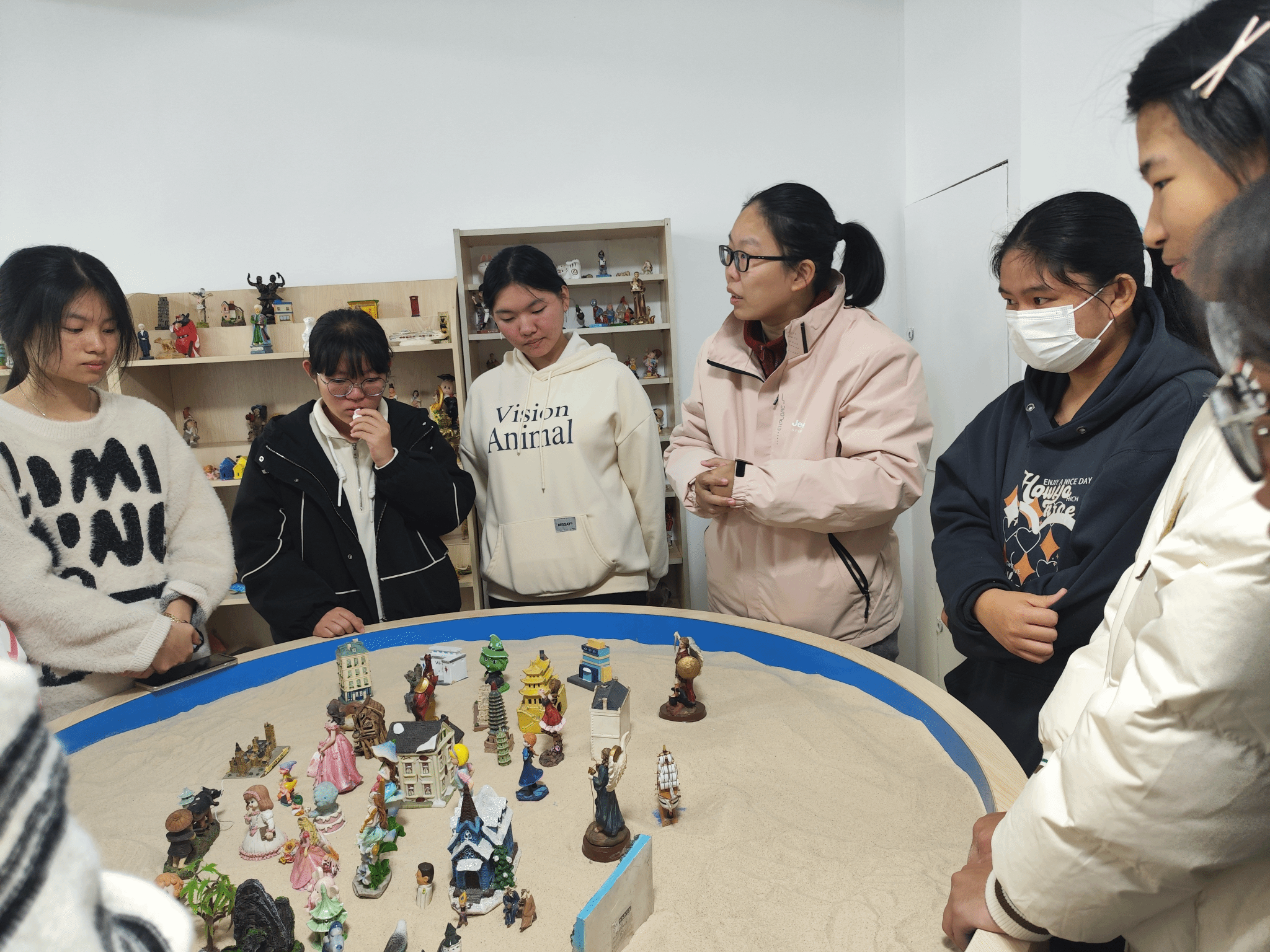 团体沙盘活动通过观察沙具摆放与场景构建动态调整引导策略,帮助同学们深入探索内心世界,理解并处理复杂情绪,寻求心理与情感的平衡。